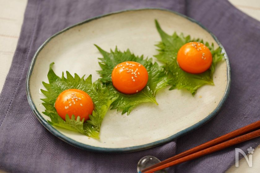 (4) 10分程度漬けたら、お皿に大葉をしいて、漬け込んだ黄身をのせて、上にごまを散らしたら完成。