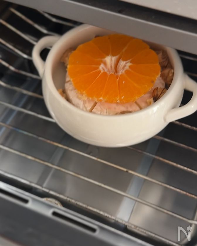 (2) 耐熱皿にのせ、輪切りにしたみかんと、砕いたくるみを乗せる