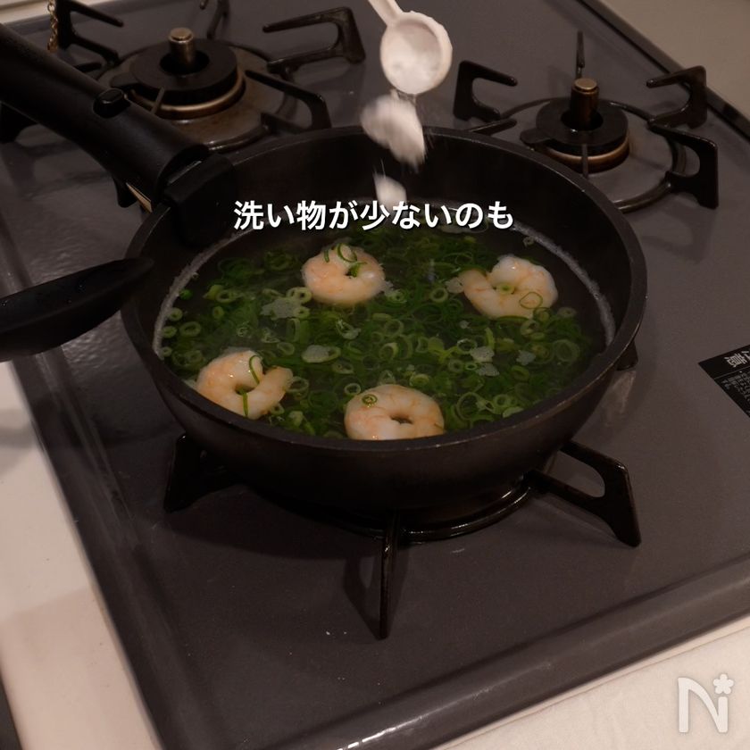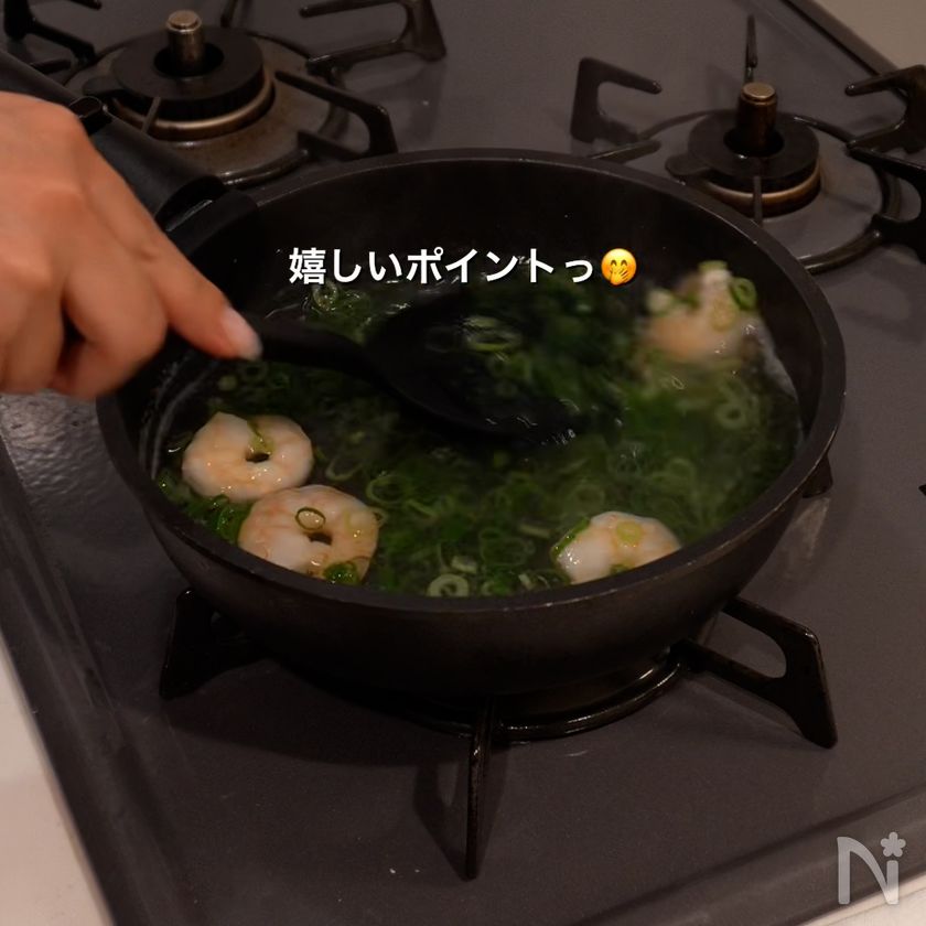(2) フライパンに水・冷凍エビ・ねぎを入れて火にかけ、エビが解凍するまで煮る。