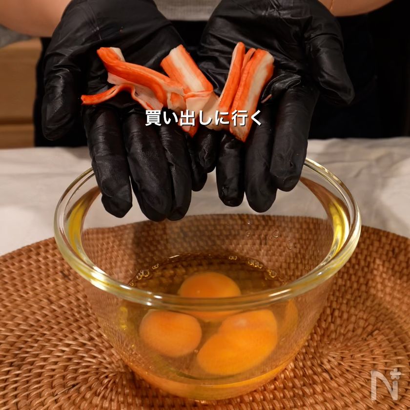 (1) カニカマをほぐし、溶き卵と混ぜて卵液を作る。