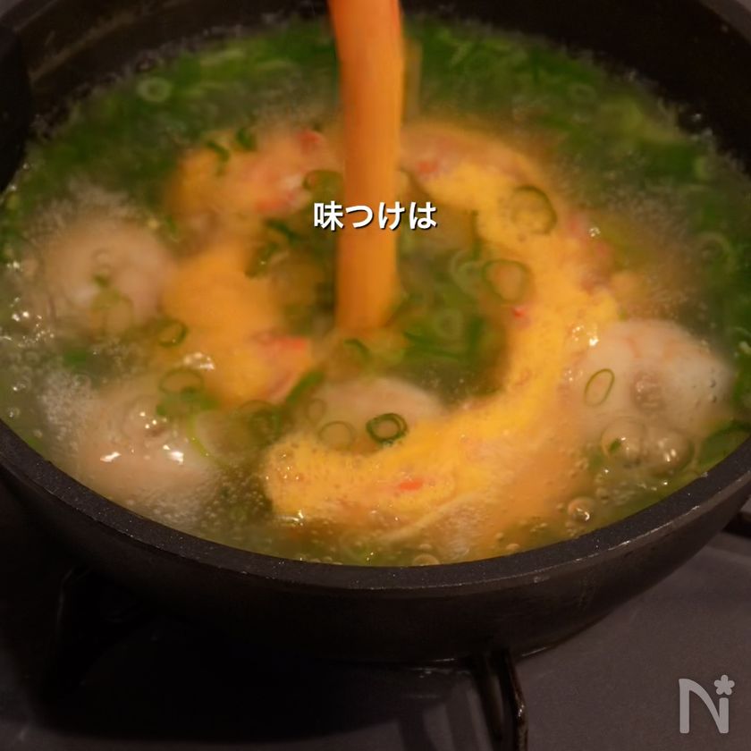 (4) 塩あんが沸騰したら、卵液を流し入れる。