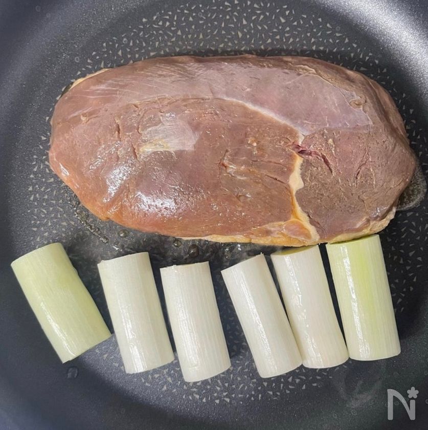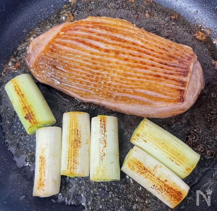 (7) 半日以上たったら鴨を取り出し、4~5cmに切った長ねぎと共に、熱したフライパンで皮目から焼く。(油は不要)