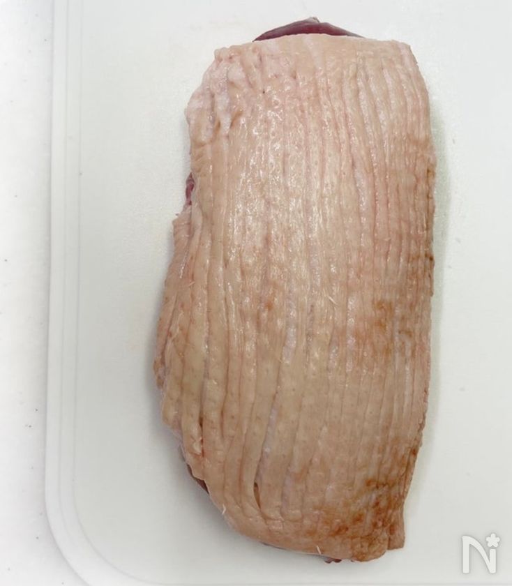 (1) 合鴨ロースは、皮を下にした時に身からはみ出ているくらいの、余分な油があれば取る。
