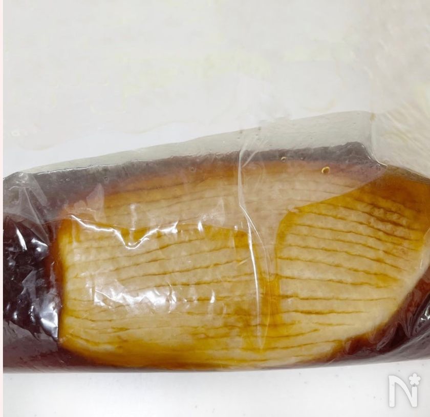 (4) 水気をペーパーで拭き、耐熱のジップロック等に入れら空気をしっかりと抜き、低温調理にかける。300gなら、58℃2時間30分。それ以上の大きさなら、もう少し長くかける。必ず竹串などで火が通っているか十分確認する。