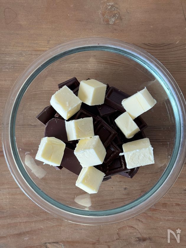 (1) 耐熱ボウルに【A】を入れて、電子レンジ(600W)で1分30秒加熱して、溶けるまでゴムべらで混ぜる。