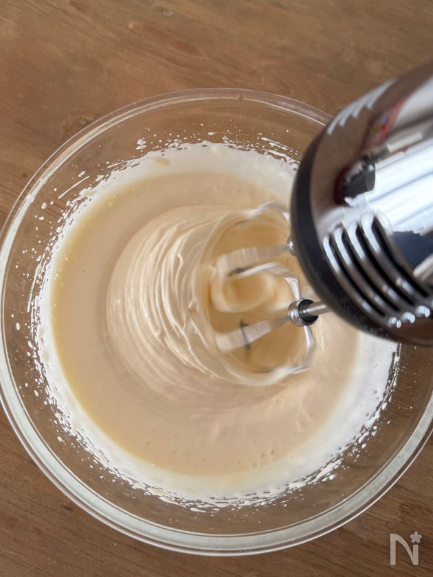(2) 別のボウルに【B】を入れて白っぽくなるまでハンドミキサーで泡立てる(りぼん状に落ちるくらい)