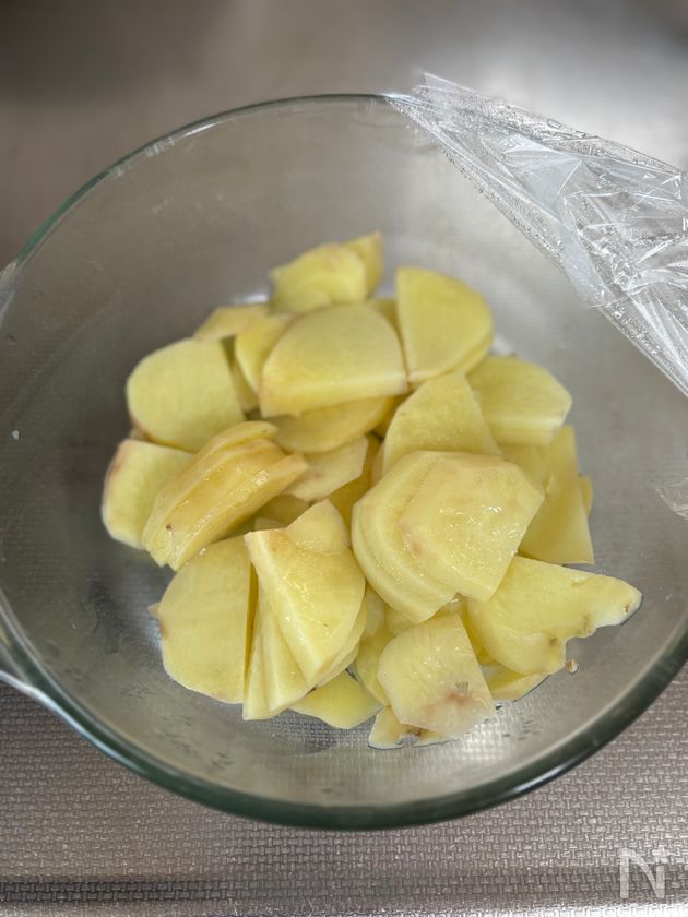 (1) じゃがいもは皮を剥き、厚さ3〜4mmの半月切りする。耐熱ボウルに入れ、水大さじ1(分量外)を加えてラップをし、600Wで3分加熱する。