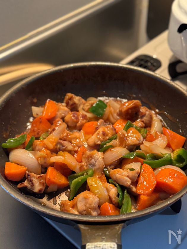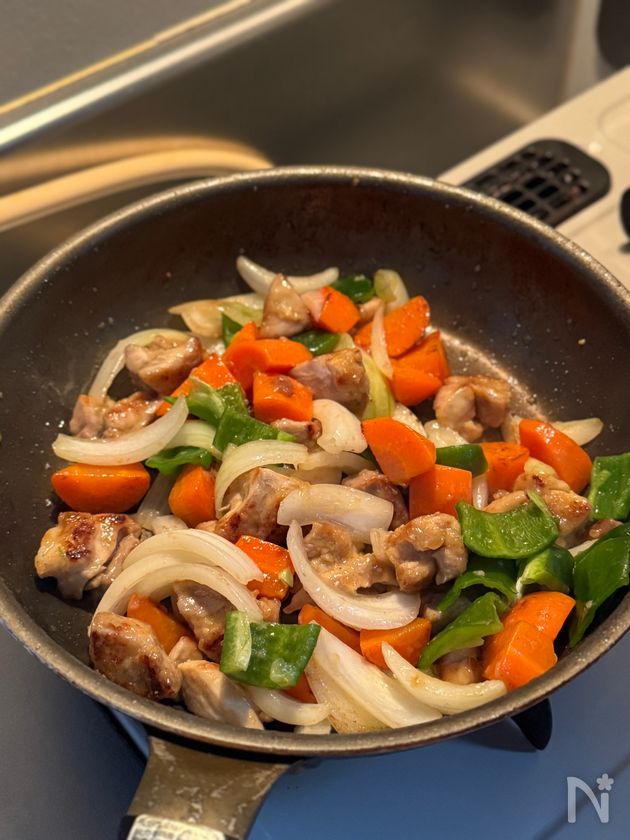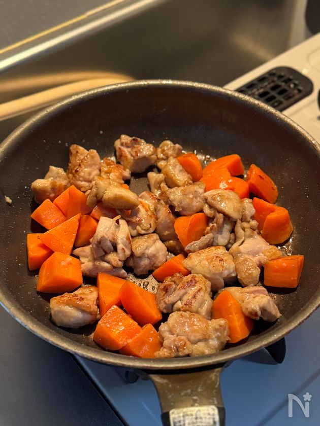 (2) フライパンに揚げ油を熱して中火で鶏肉を両面2、3分ずつ揚げ焼き。こんがりしてきたら人参も加えて焼き色をつける。