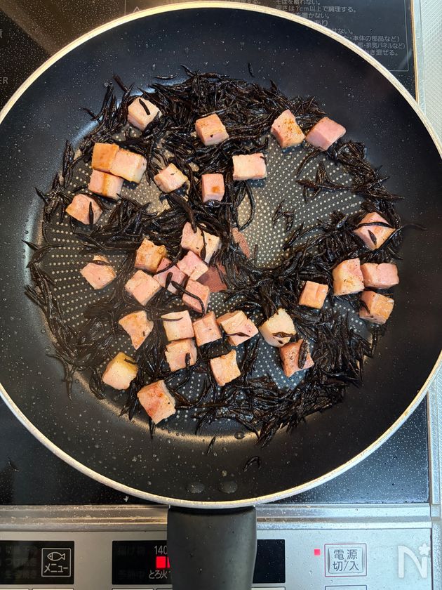 脂が出て香ばしくなったら、ひじきを加えてさらに2〜3分炒める。