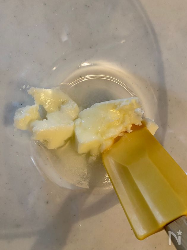 (1) バターのボウルにきび砂糖を加え、ゴムベラで混ぜる。