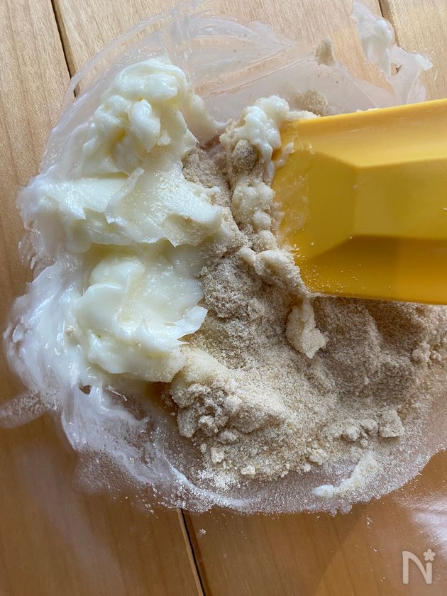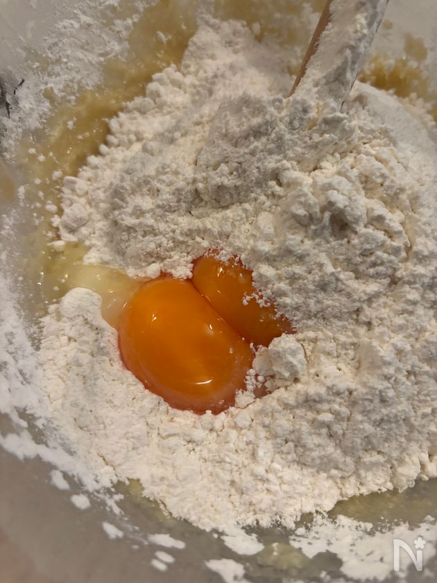 (2) 1に卵黄を加えて混ぜ、米粉を加えてさらに混ぜる。