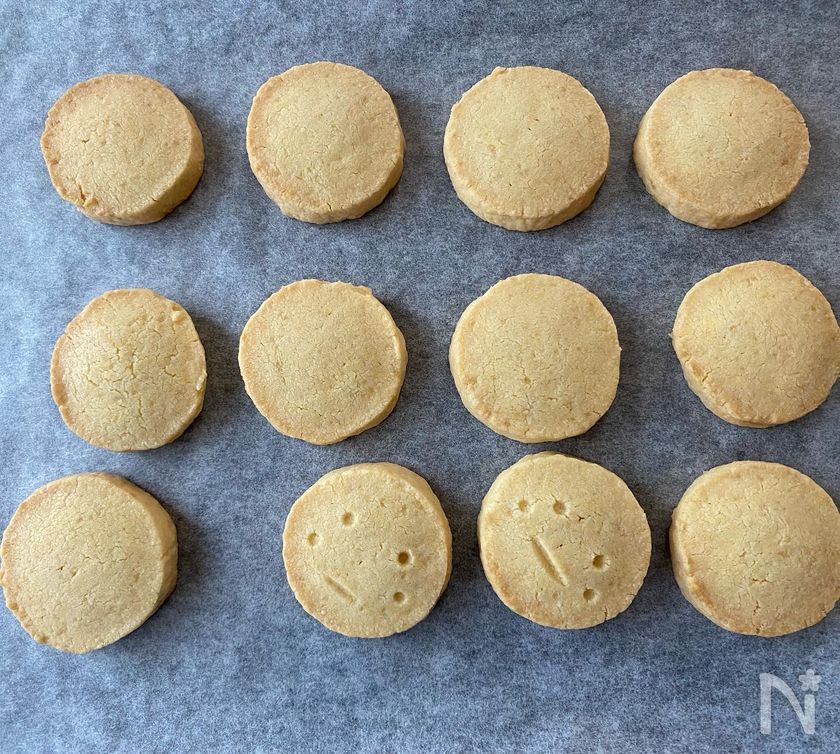 (4) 3を7mm幅にカットしてクッキングシートを敷いた鉄板に乗せ、170度のオーブンで20分焼く。