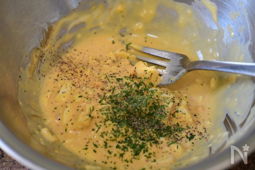 (2) 乾燥パセリ、粗びきホワイトペッパーを加える。