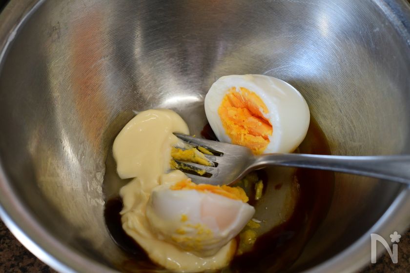 (1) ボウルに殻を剥いた ゆで卵、【A】を加え