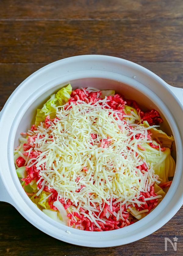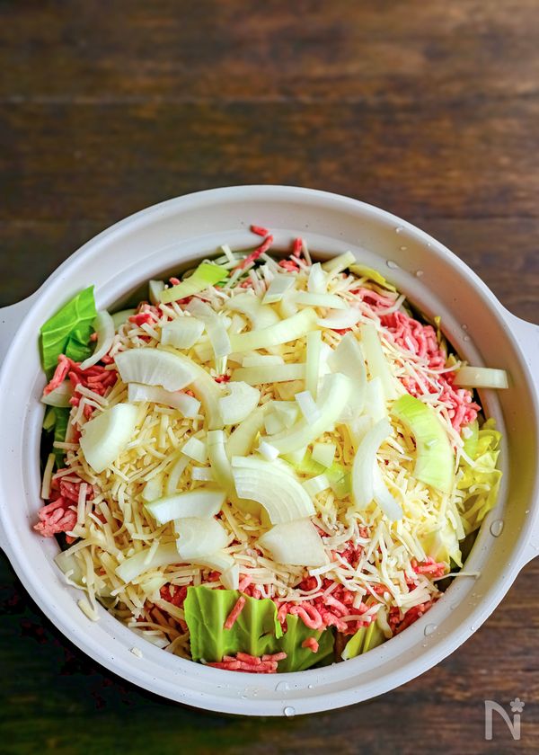 (4) その上にきゃべつ1/3量、玉ねぎ1/3量、ひき肉1/2量を重ね、塩・こしょう少々振ってから(チーズ入りの場合はシュレッドチーズ半量を乗せ)その上に残りの玉ねぎを乗せる。