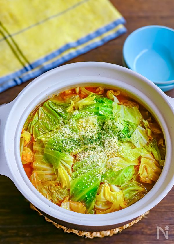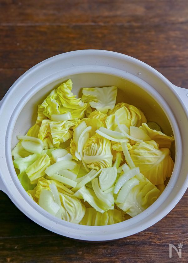(2) 鍋にきゃべつ1/3量を入れ、玉ねぎ1/3量を乗せる。
