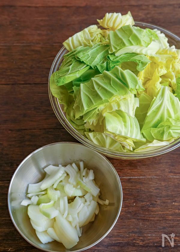 (1) きゃべつは大き目のざく切りに、玉ねぎは縦1/4に切り、繊維を断ち切る用に5~8㎜に切る。