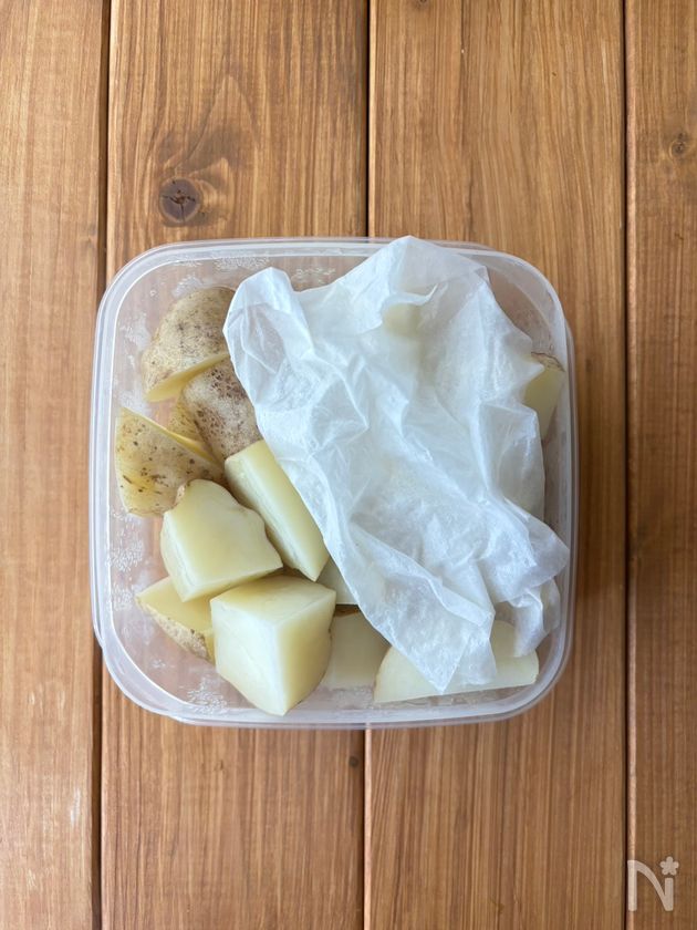 (2) 耐熱容器に軽く水気を切ったじゃがいもを入れ上に湿らせたキッチンペーパーを乗せる。