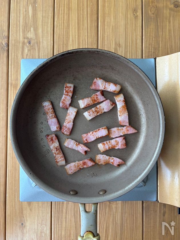 (3) 中火で熱したフライパンにブロックベーコンを加え、焼き色がつくまで焼いたら一度取り出す。