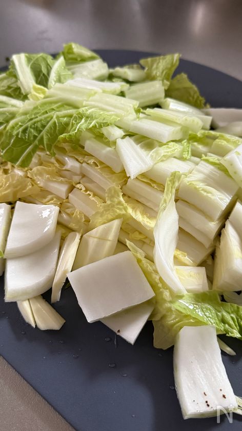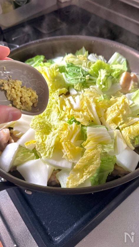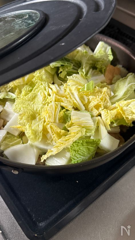(4) .皮目が焼けたら、絹厚揚げと白菜、白だしを重ね入れ蓋をして10分煮る。