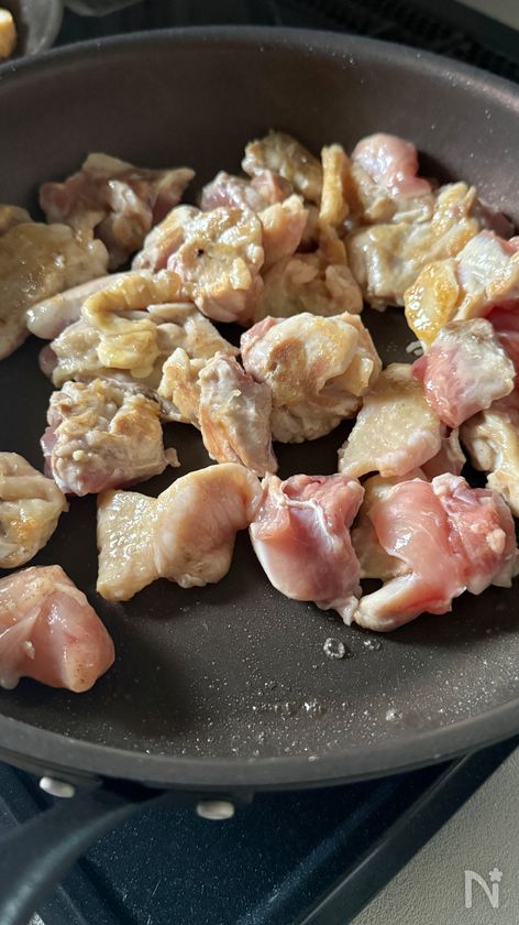 (3) 鶏肉の皮目を下にして中火にかけ表面を焼く。