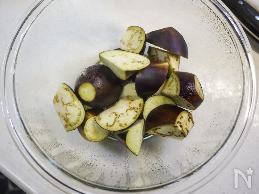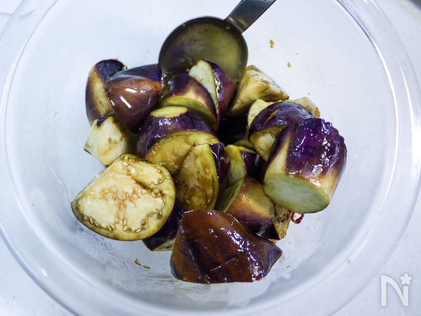 (3) ボウルに茄子を入れて全体に混ぜ合わせたら出来上がりです