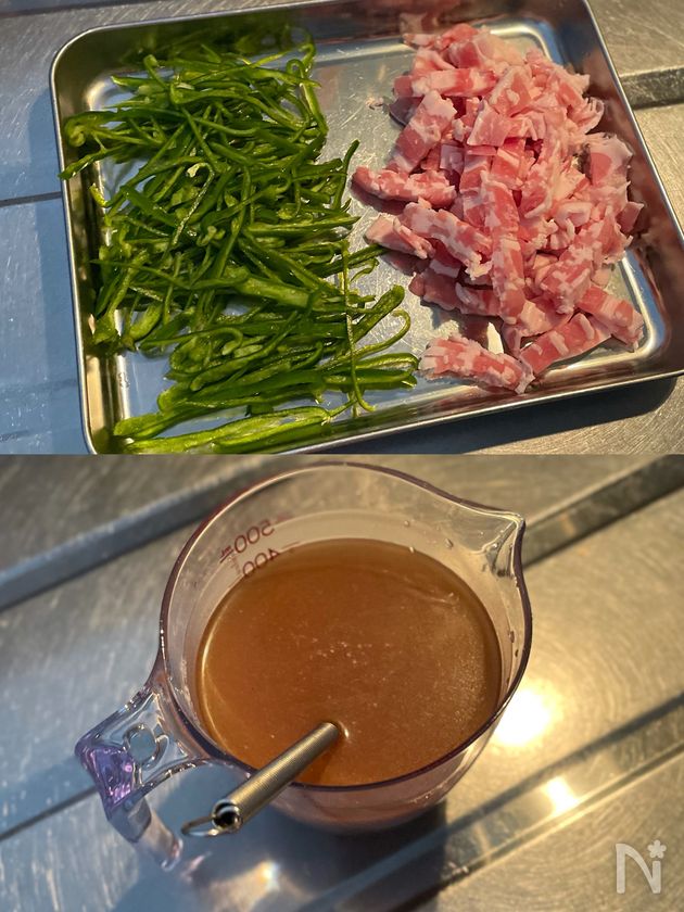 (1) 豚バラ肉は1cm幅の細切り、ピーマンは千切りにする。【A】は混ぜ合わせておく。
