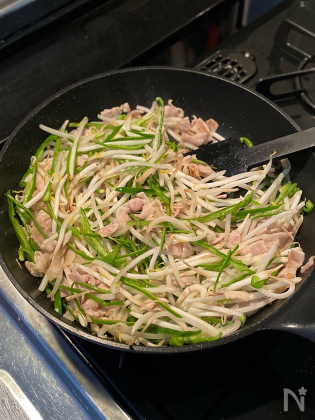 (2) 中火に熱したフライパンで豚バラ肉を加え、塩こしょうをふって炒める。火が通ったらピーマンともやしも加えてさっと炒める。