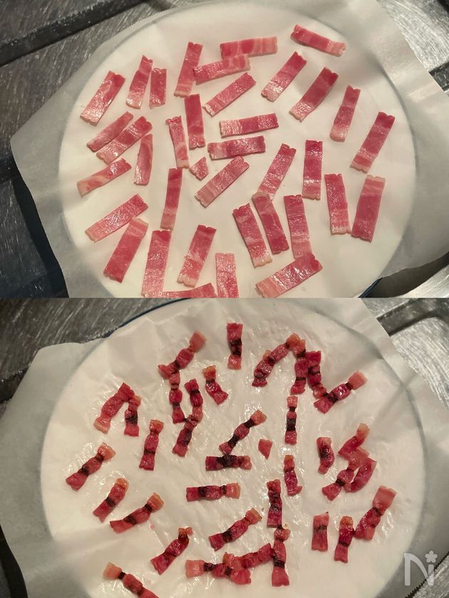 (2) 薄切りベーコンは1cm幅に切り、オーブンシートを敷いた耐熱皿に重ならないように並べ、ラップをせずに焼き色がつくまで約2~3分様子を見ながら加熱する。