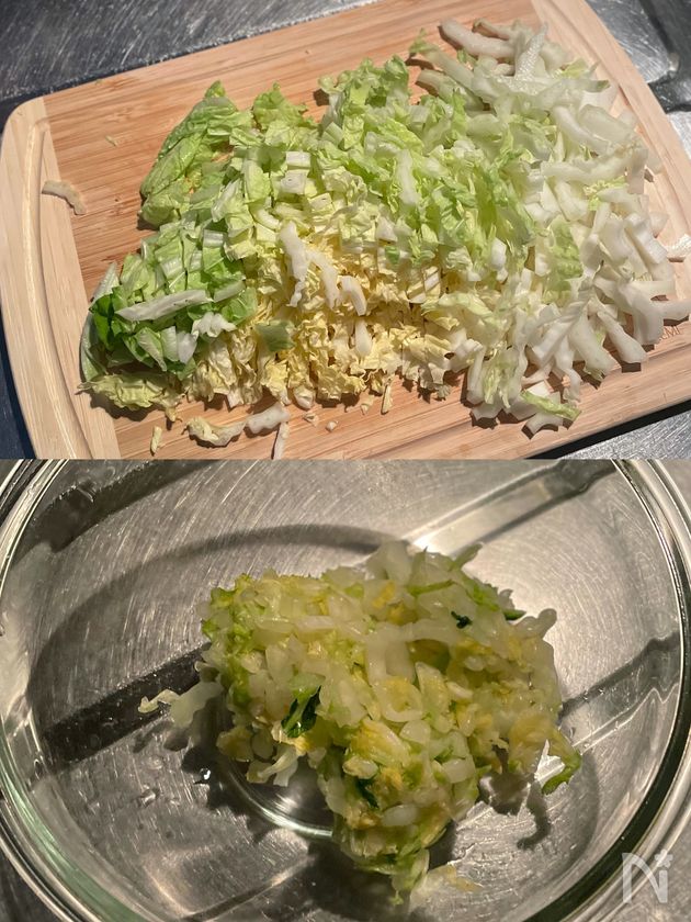 (1) 白菜は1cm幅に切り、塩をふってもみこむ。5分置いたら水気をしっかり絞る。