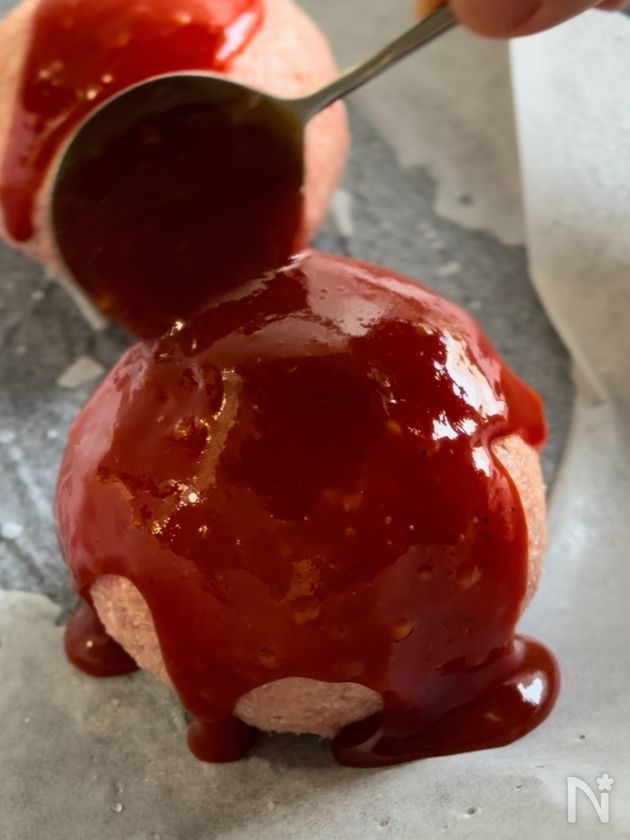 (2) ➀を2つに分けてそれぞれ丸め、中にプロセスチーズ2個ずつ入れてボールみたいに成形し天板の上におく。