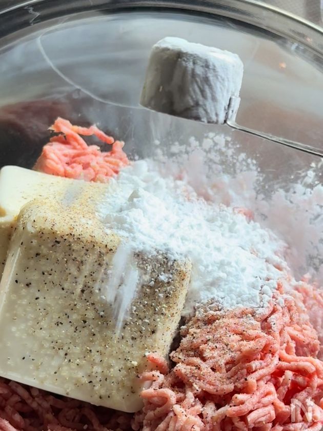 (1) ボウルに豚ひき肉・絹ごし豆腐・片栗粉・塩コショウ・コンソメ顆粒を入れて良く混ぜる。