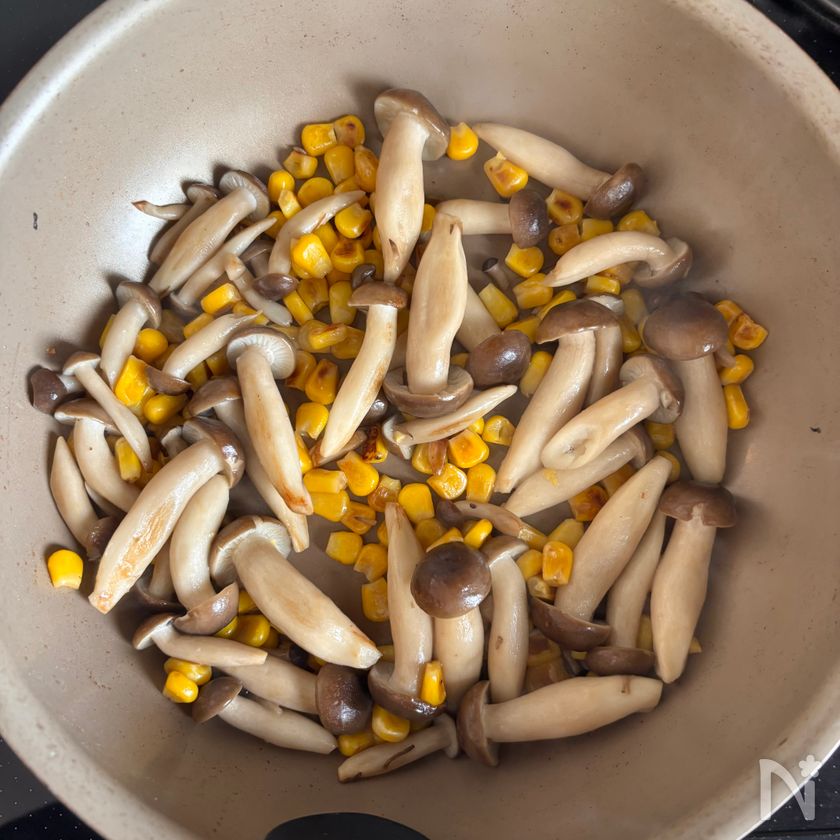(1) フライパンに油を熱し、しめじ、冷凍コーンを入れて焼き色がつくまで炒める。