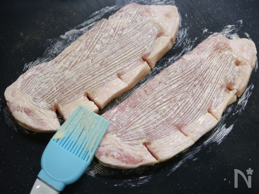 (1) 豚ロース肉の筋をしっかり切って、塩・胡椒する。