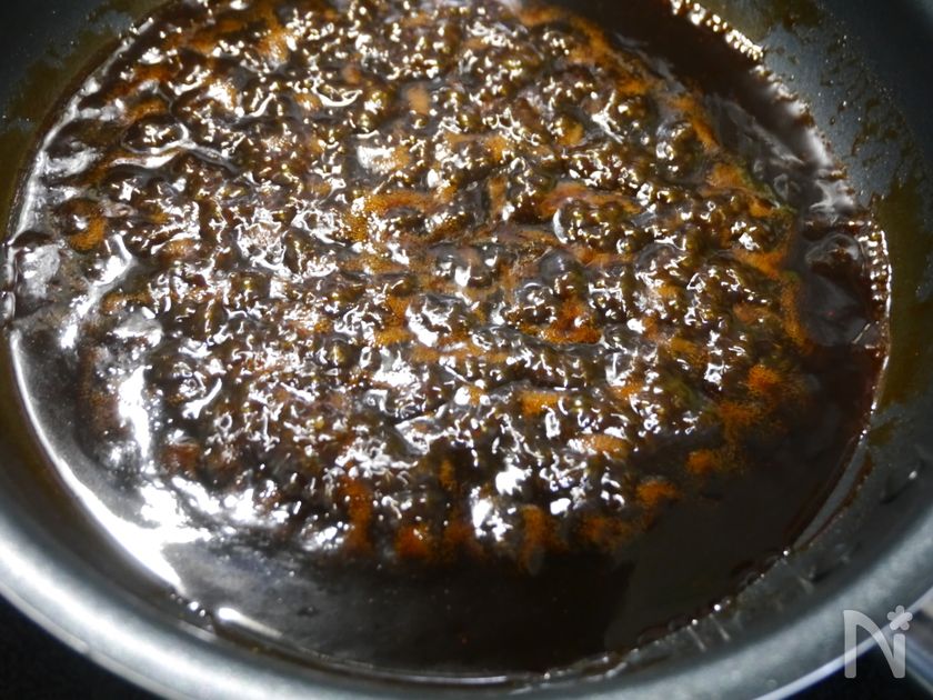 (下準備) 味噌たれは、水飴・砂糖・八丁味噌と水100mlを煮詰める。