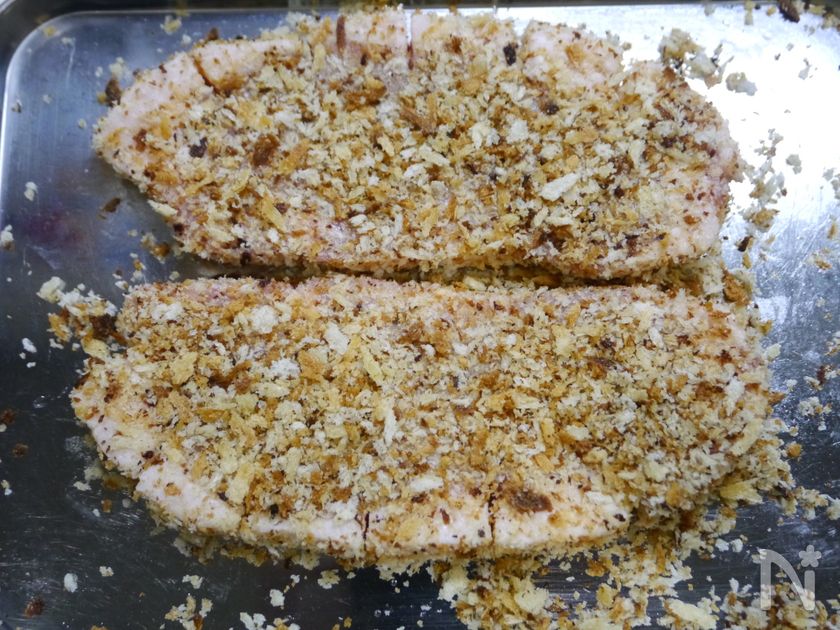 焼きパン粉で焼くとまるで揚げたように仕上がります。