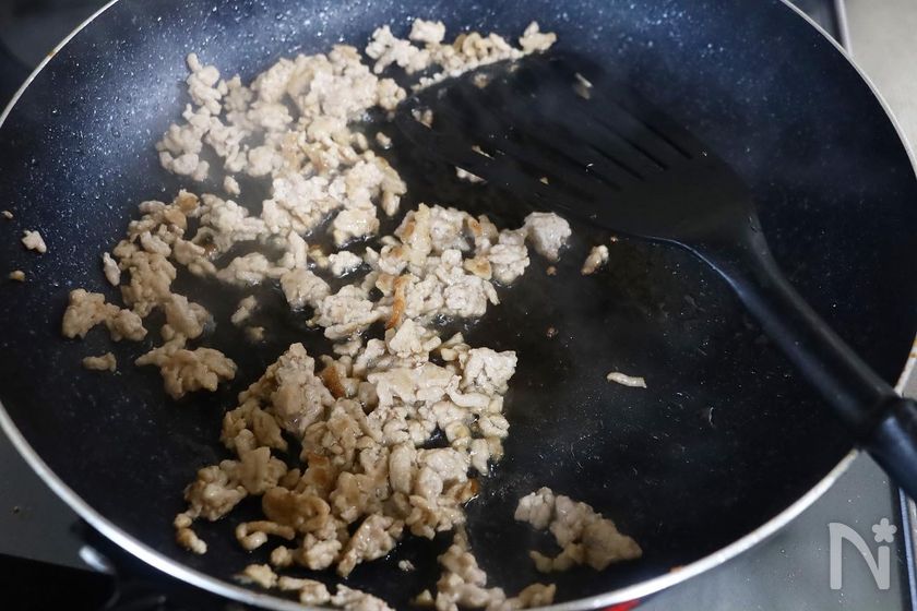 (2) フライパンにサラダ油をしき、豚ひき肉をほぐしながら色が変わるまで炒める。