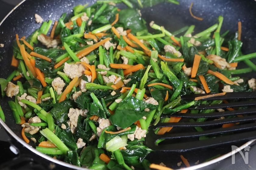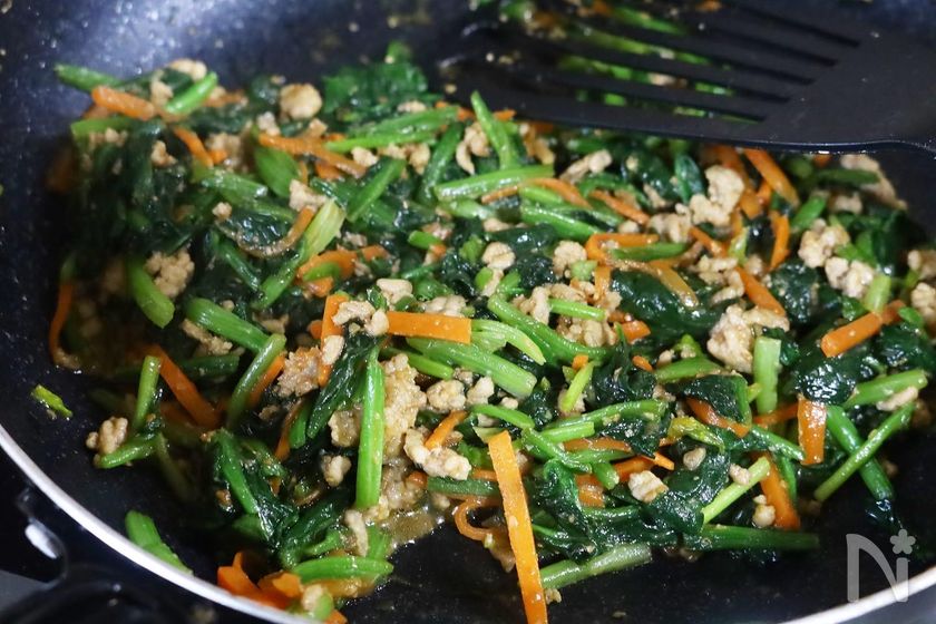 ご飯が進む☆ほうれん草とにんじんの肉味噌炒め