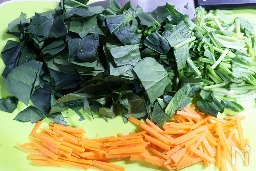 (1) ほうれん草は根元を切り落とし、長さ2cmに切る。にんじんは長さ2cmの千切りにする。