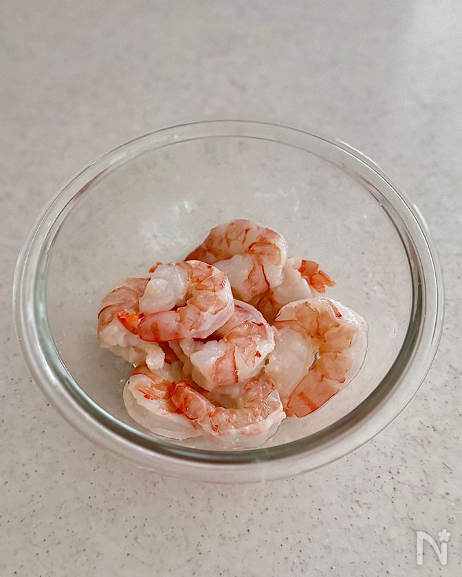 (1) 冷凍むきエビは自然解凍する。塩と片栗粉少々(分量外)を揉み込み流水で洗い、水気をしっかり拭き取ってから塩麹を揉み込む。