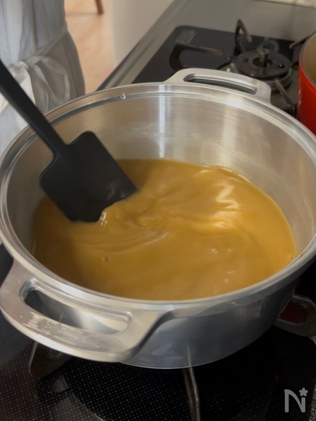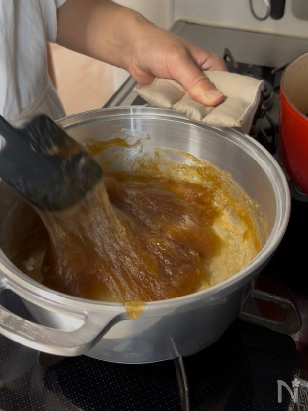 (4) 固まり始めたら弱火にして、全体的にツヤが出るまで天地をひっくり返しながらゆっくり火を通す。