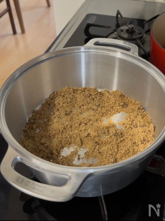 (下準備) 鍋に黒糖と砂糖を入れ、黒糖の固まりをつぶしながら混ぜ合わせておく。