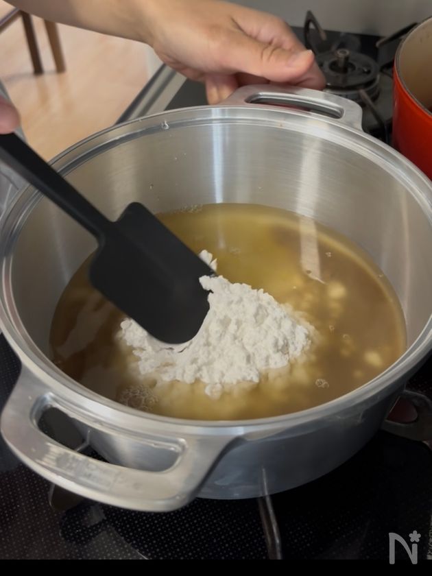 (2) 片栗粉と水を加えて混ぜ、片栗粉が溶けたら火をつける。