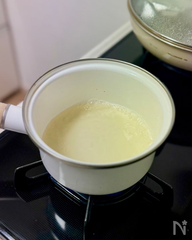 (4) 耐熱容器に注ぎ、アルミホイルでふんわり蓋をしてフライパンに並べる。容器の半分ほどの高さまで湯を張り中火にかけ、フツフツしてきたら蓋をして弱火で15分蒸す。火を止めてそのまま10分おく。