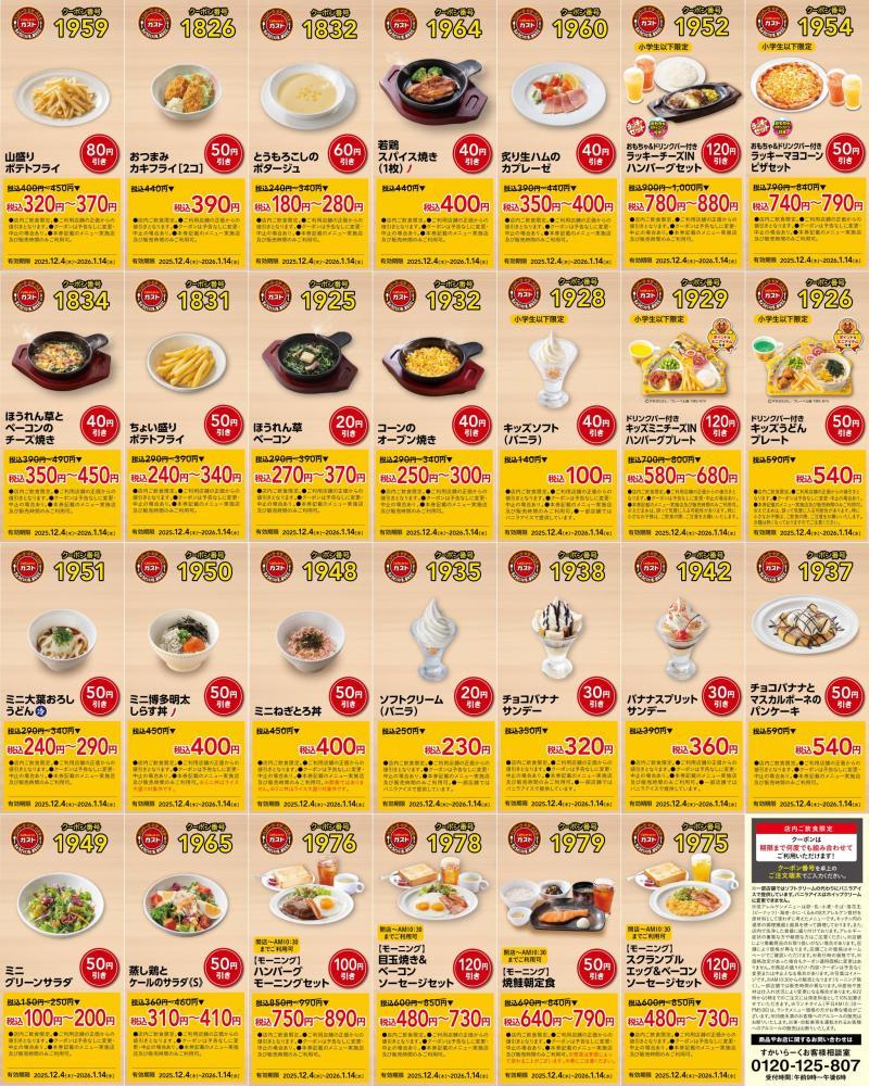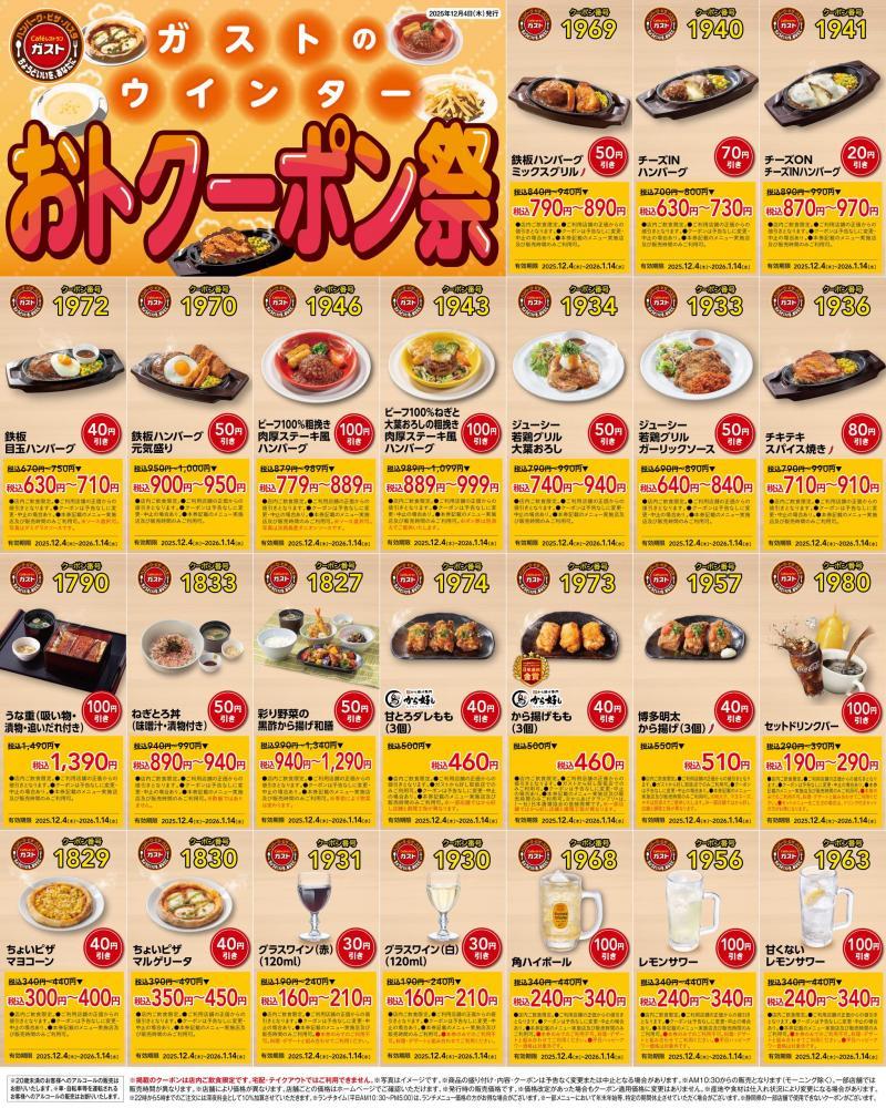 ガスト公式Xでは、26年1月14日まで使えるクーポンも公開しています。ただし、重複しているメニューは33%オフクーポンのほうがお得に食べられますよ。