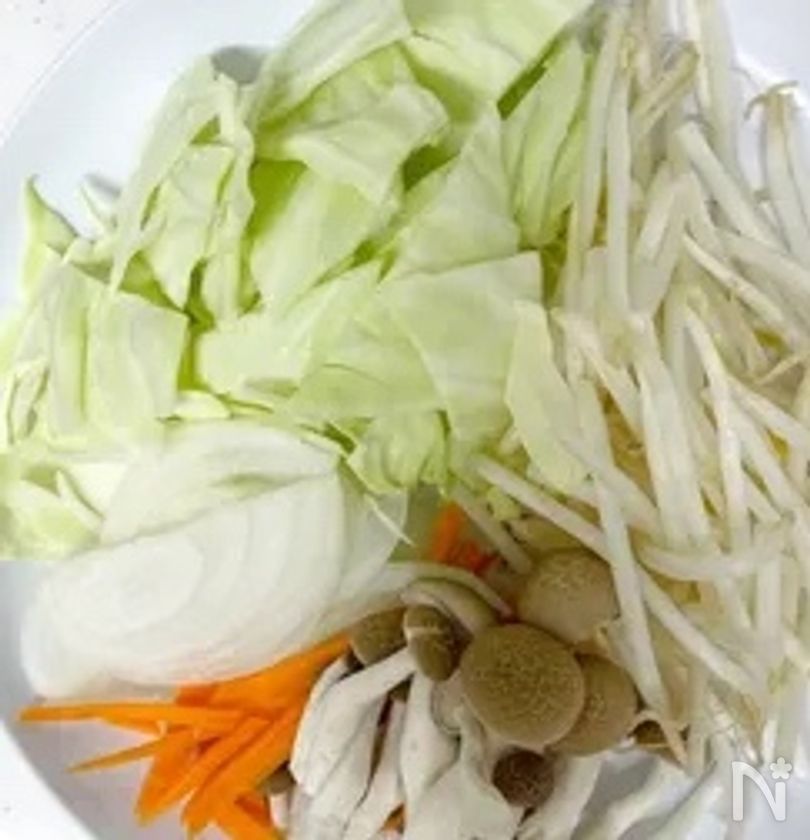 (2) キャベツは、2~3cmくらいに乱切り、人参は短冊切り、玉ねぎは薄切り、しめじは石づきを取りほぐす。