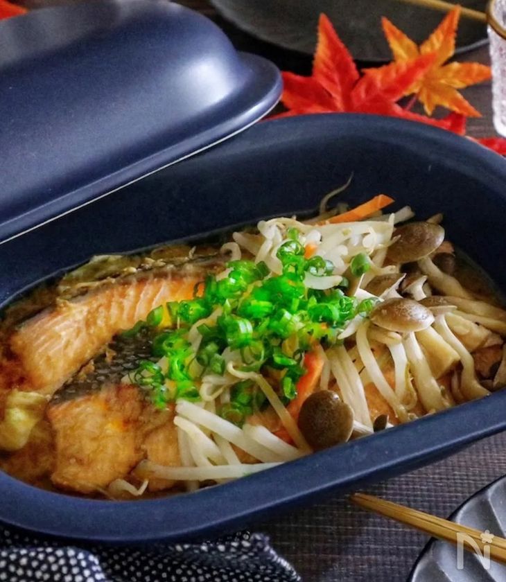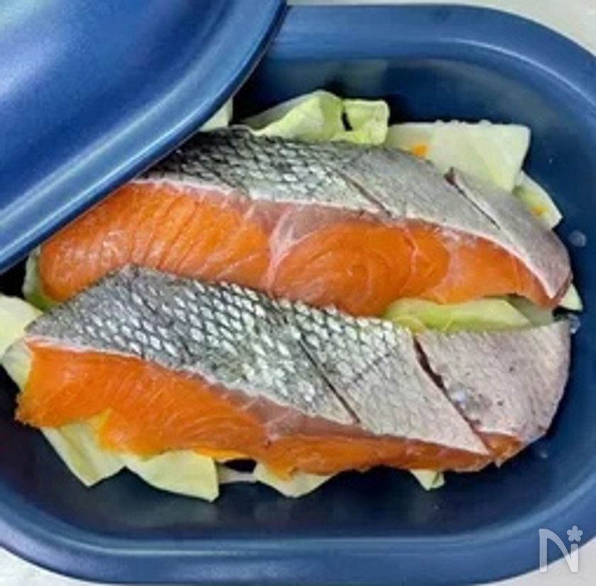(4) レンジ対応容器に、玉ねぎ、キャベツを広げ、上に鮭をのせる。