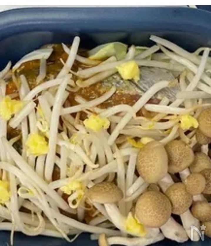 (5) 【A】をかけ、人参、もやし、しめじをのせ、バターをちらす。