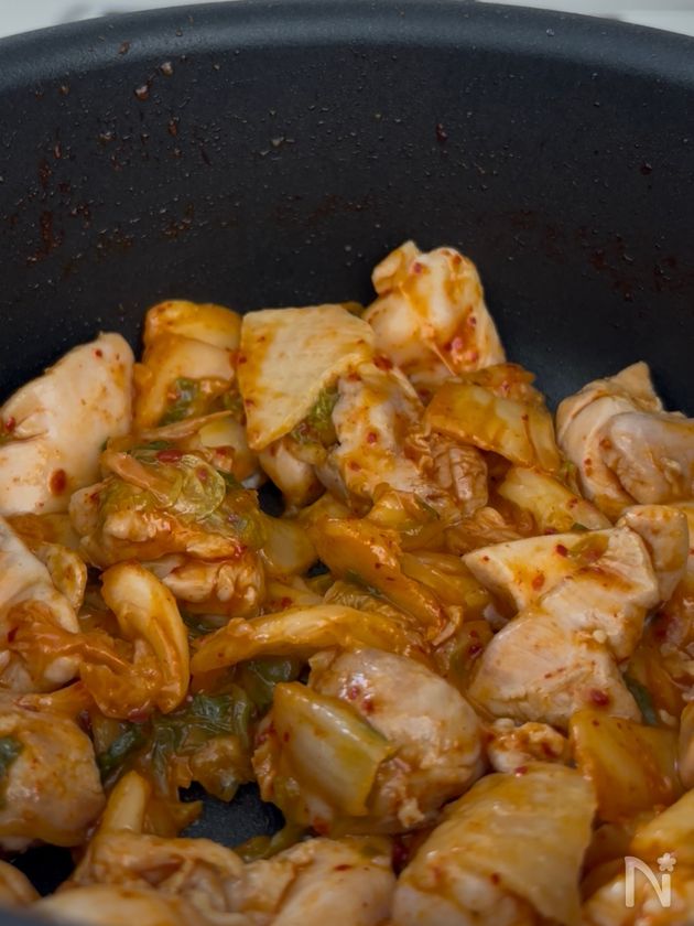 (2) 鍋にごま油をひいて中火で熱し、鶏もも肉とキムチを炒める。3分ほど炒めてお肉の色がしっかり変わったら、【A】を加えてよく混ぜる。
