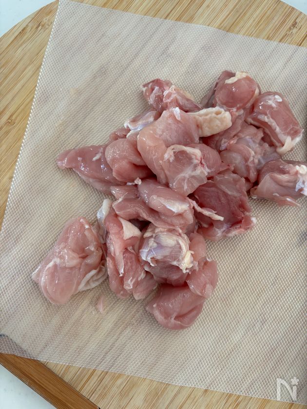 (1) 鶏もも肉を1口サイズに切る。長ねぎは5mm幅の斜め切りにする。